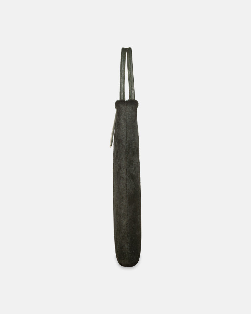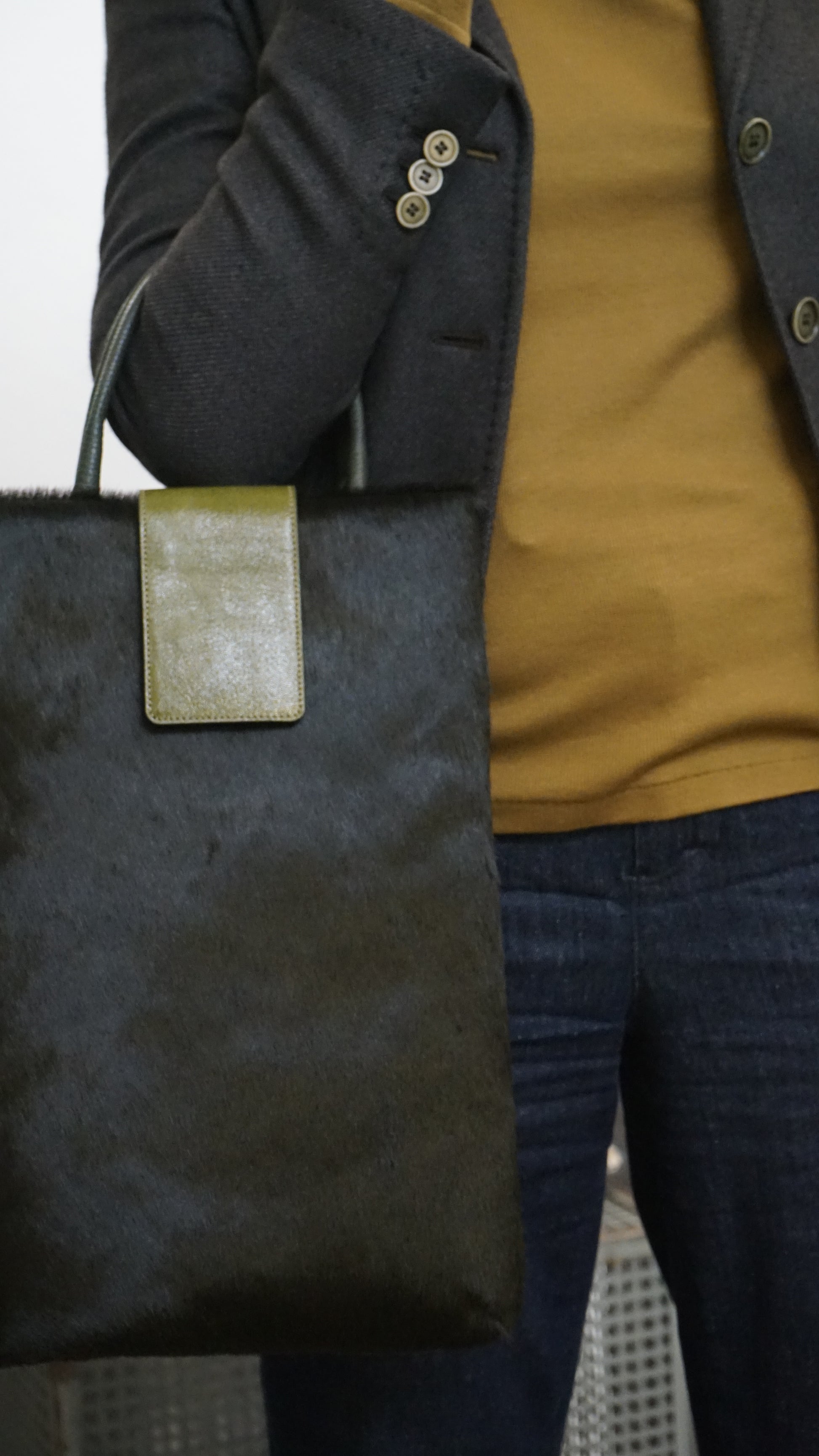 Interamente realizzata a mano in Italia, combina con maestria tre diversi tipi di pelle pregiata: il cavallino verde scuro, raffinato e profondo; la pelle semi-lucida della patta, che cattura la luce con discrezione e la morbida pelle martellata dei manici, che dona equilibrio e armonia alla composizione.